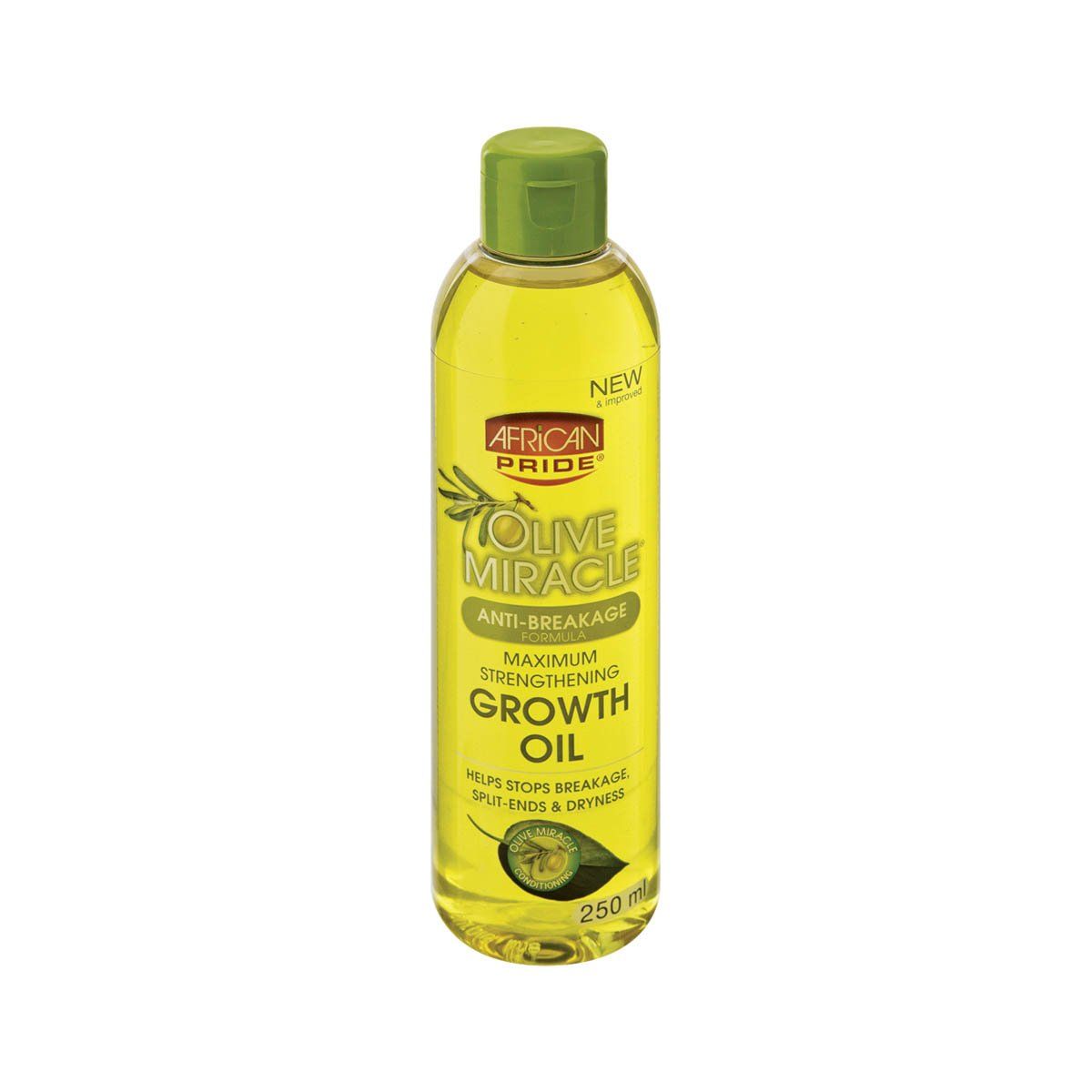 African Pride Olive Miracle Maximum Strengthening Growth Oil 250ml uses powerful extra virgin olive oil to deeply condition hair and the scalp. Used regularly, it banishes hair breakage, split ends and dryness.