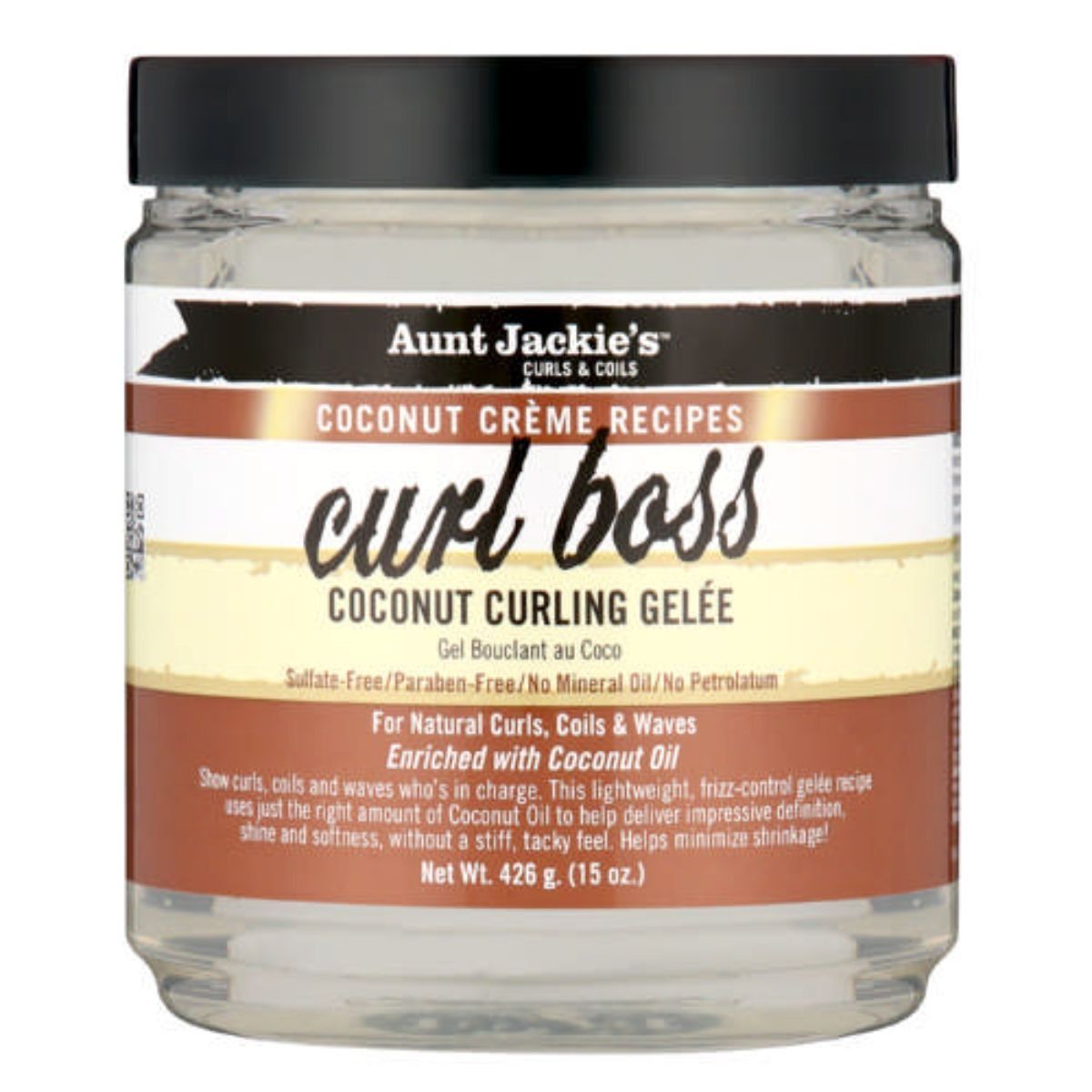 Aunt Jackie’s Curl Boss Coconut Curling Gelée is the perfect styling remedy for help achieve soft, bouncy, smooth, hydrated, radiant-looking curls, coils and waves. Great for 1c – 4c textures, wash-n-go styles, and any curly style in need of long lasting moisture. When used properly, and along with other Aunt Jackie’s therapies, Curl Boss can help minimize shrinkage, and won’t weigh hair down, or cause flaking or caking.