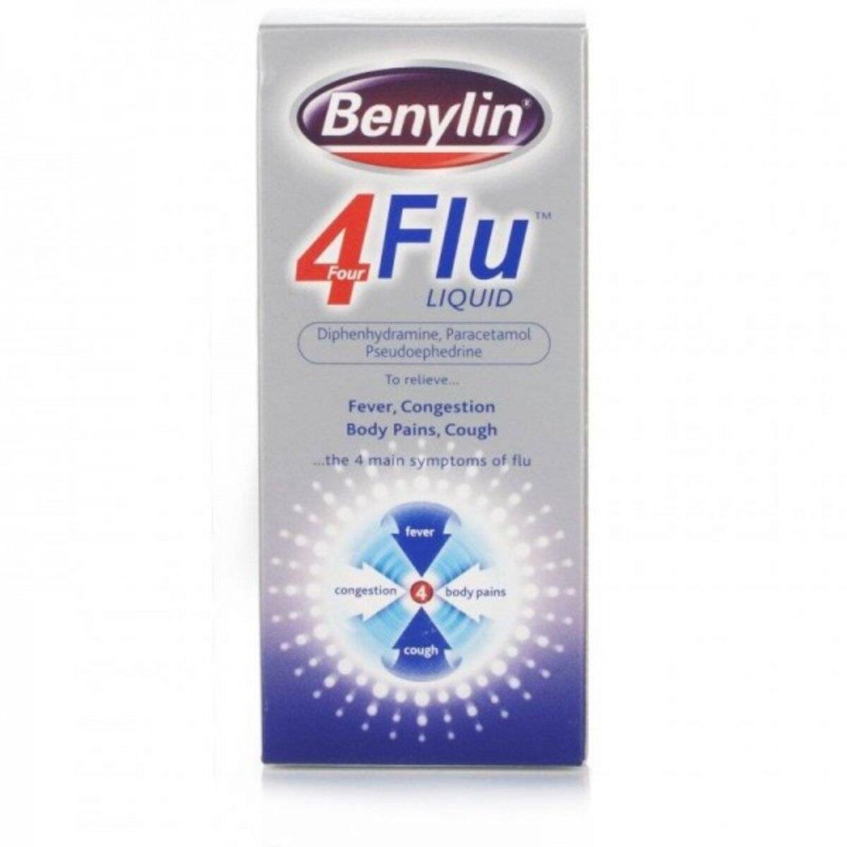 Benylin 4 Flu Liquid is a medicine used to help relieve the four main symptoms of flu: fever, body aches, nasal congestion and coughing. The ingredients it uses to do this are: paracetamol, an analgesic which helps to relieve aches and pains and fever (high temperature), diphenhydramine, an antihistamine which helps relieve coughing and dry secretions and pseudoephedrine, a decongestant which helps unblock stuffy noses.