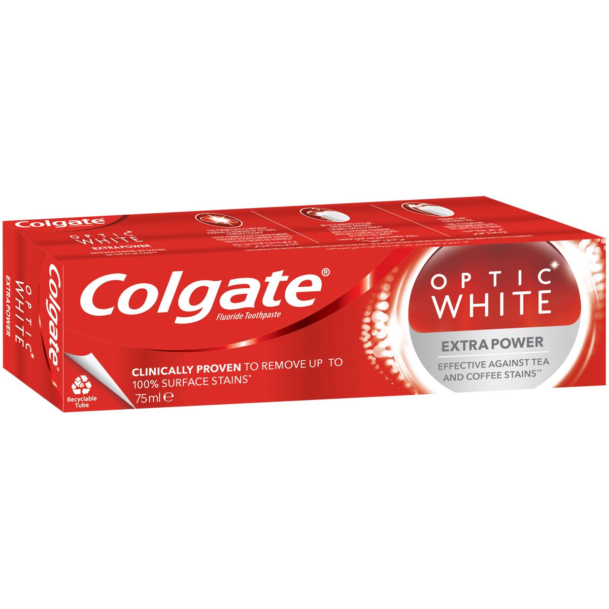 For a dazzling white smile, use Colgate Optic White Extra Power 75ml which is clincally proven to help remove up to 100% extrinsic stain* and enamel safe for daily use. * after 2 weeks of twice daily use