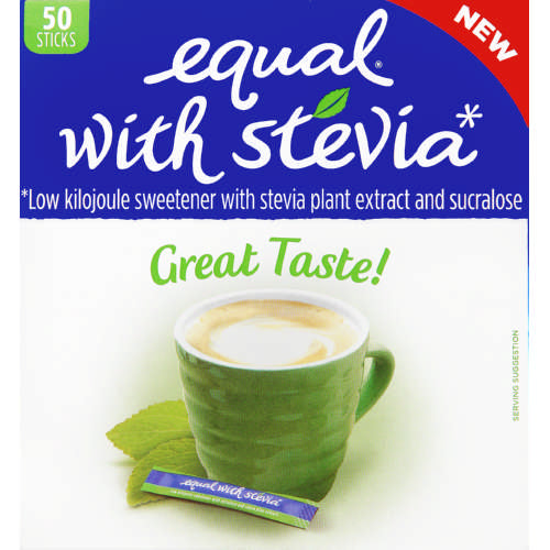 Equal With Stevia 50 Sticks 50g is a great tasting blend that specially combines extracts of the stevia plant, from natural origin, and the smooth sweetness of sucralose to offer you a unique sweetening experience. One equal stick (15 kJ) is equivalent in sweetness to two level teaspoons of sugar (170 kJ).