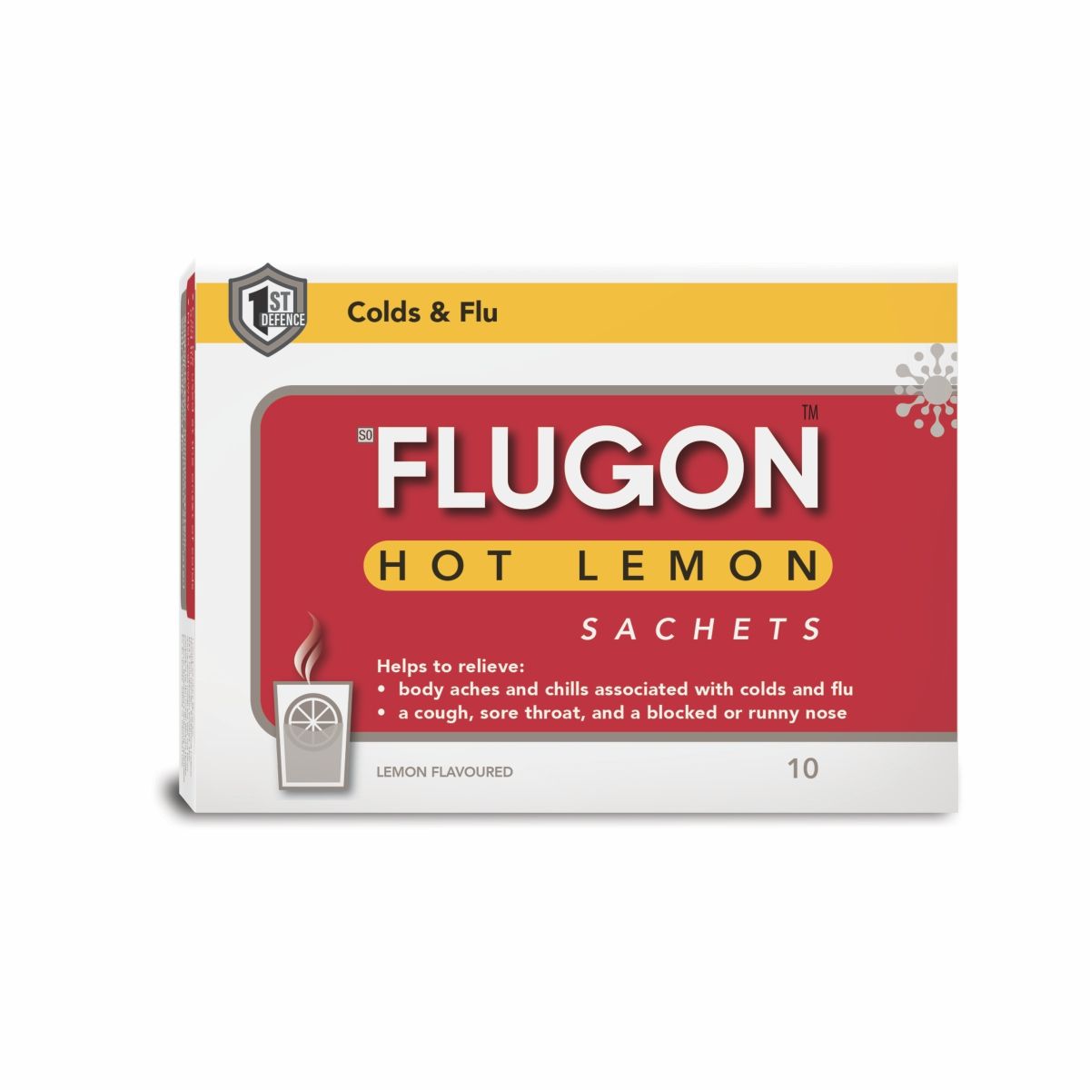 FLUGON HOT LEMON helps with immune support throughout the year, and relieves body aches/chills, cough, sore throat and a blocked or runny nose associated with colds and flu.
