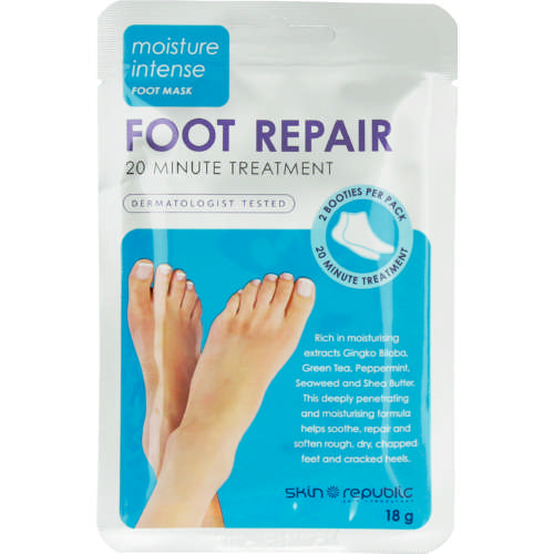 Soothes rough, dry feet and cracked heels.Deeply moisturising.Skin nutrition.Skin Republic is an advanced skin care range combining the latest features in advanced skin care with the restorative properties found in nature. This hypo-allergenic dermatological skin care range has been scientifically formulated and laboratory tested, resulting in a collection of products focused on nourishing, rejuvenating and cleansing to help you maintain healthy looking skin.The specially designed booties contain skin filler ingredients that soak into the skin. The concentrated extracts supply nutrients and improve hydration for a healthier skin.Each foot repair mask contains 2 booties for one application.