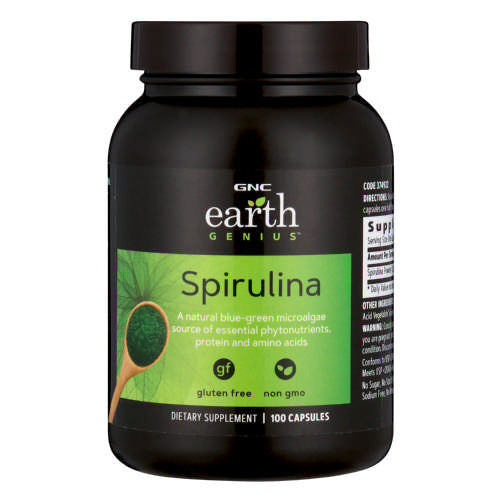 GNC Earth Genius Spirulina Dietary Supplement 100 Capsules are high in protein and nutrients. It is carbohydrate and sugar-free, as well as gluten-free and non-GMO.