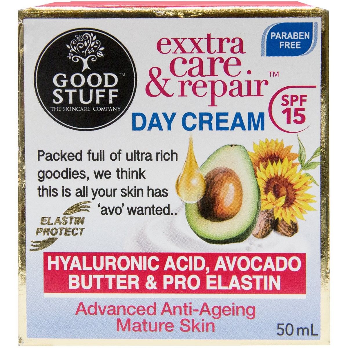 Good stuff face care day cream extra care and repair is an ultra-rich day cream that smoothens & moisturises without feeling greasy. It has UVA/B sun protectors that help prevent premature ageing and also has a spf of 15. The skin-loving goodness of tocopheryl-rich avocado butter combines with pro elastin & vitamin E. With its regular use the skin is left feeling supple & rejuvenated.