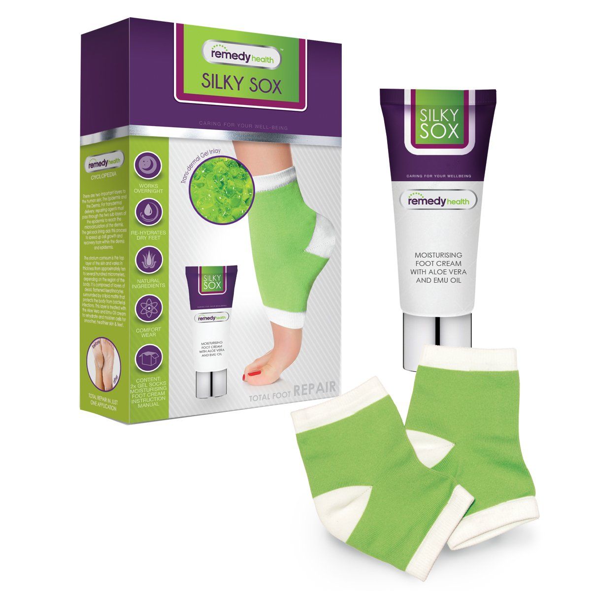 Silky Sox uses your body heat and the gel lining to repair cracked skin and calluses. It locks in the moisturising cream allowing for deep penetration while you sleep, keeping your feet or cracked elbows soft, supple and hydrated.