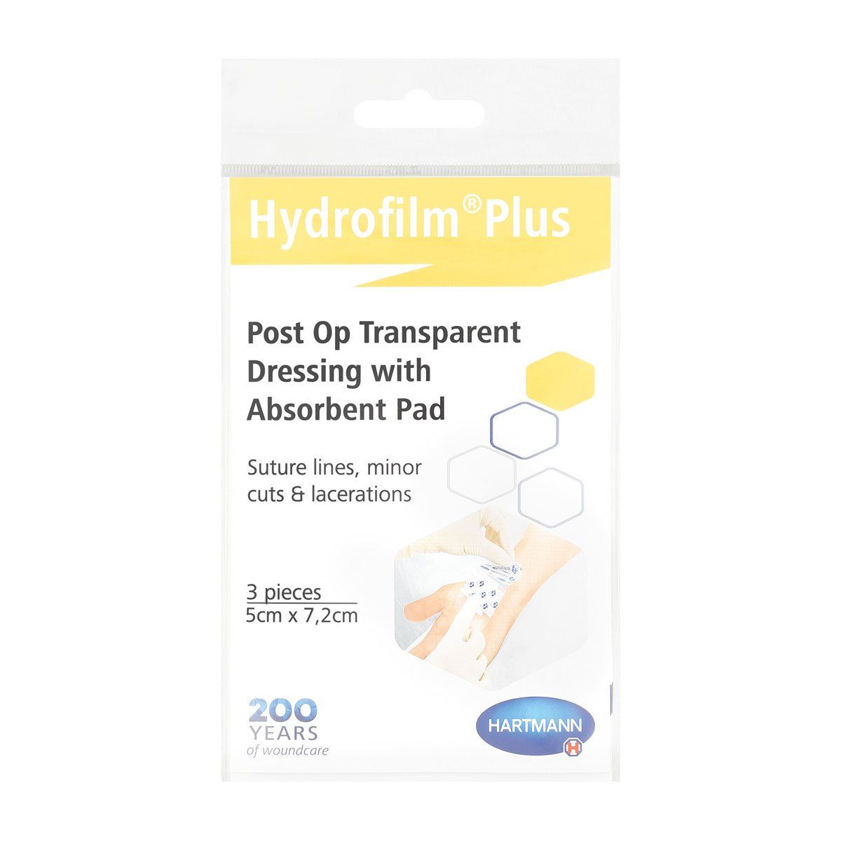 Hartmann plus adhesive film dressing 5x7.2cm 3 pieces can be used for suture lines, minor cuts, lacerations and grazes. Features a highly absorbent wound dressing pad that does not stick to the wound, with a semi-permeable polyurethane film which is impermeable to germs and waterproof. Transparency makes it possible to observe the wound.