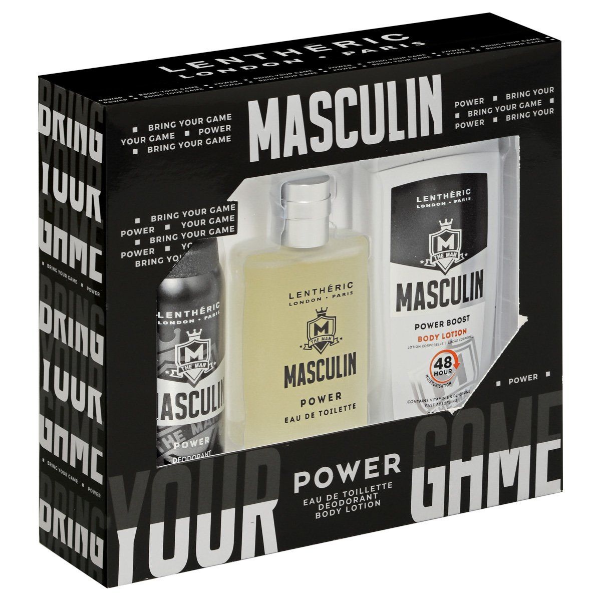 A modern fougère powdery fragrance with a warm musky scent and hints of amber and sandalwood. A giftset consisting of: masculin power eau de toilette 100ml & deodorant spray 150ml. What's in the box - 1 x eau de toilette 100ml, 1 x deodorant spray 150ml