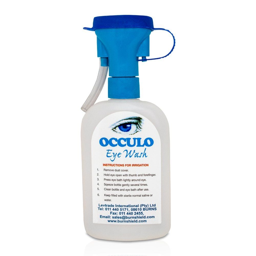 First aid eyewash facility, small, easily installed allows quick access, wall mounted plugs and screws provided, directional sign shrink wrapped with unit, tamper proof seal provided and includes occulo eyewash bottle.