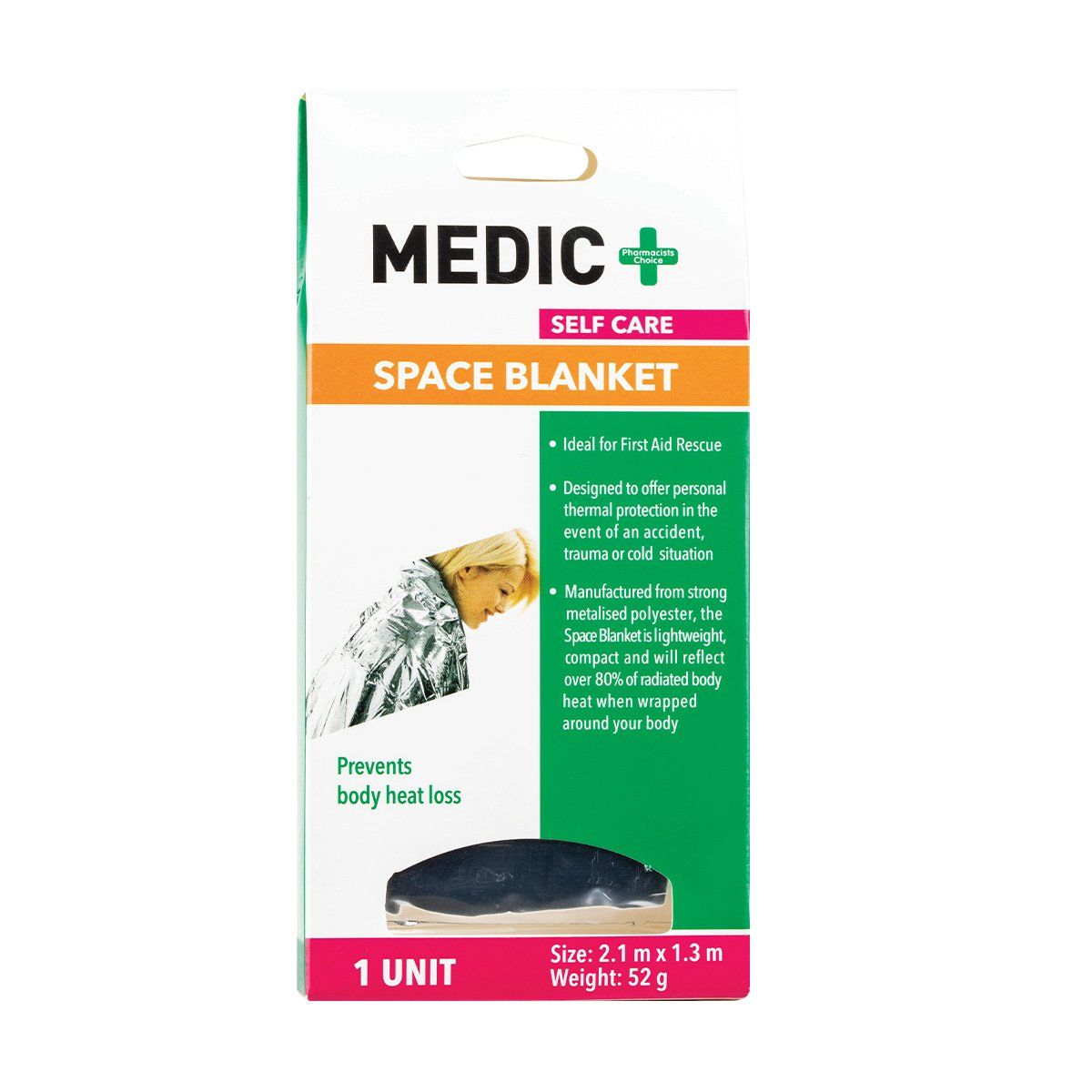 Pharmacist choice medic thermal space blanket is ideal for first aid rescue. It is designed to offer personal thermal protection in the event of an accident, trauma or a cold situation. It is manufactured from strong metalised polyester, the space blanket is lightweight, compact and will reflect over 80% of radiated body heat when wrapped around your body.