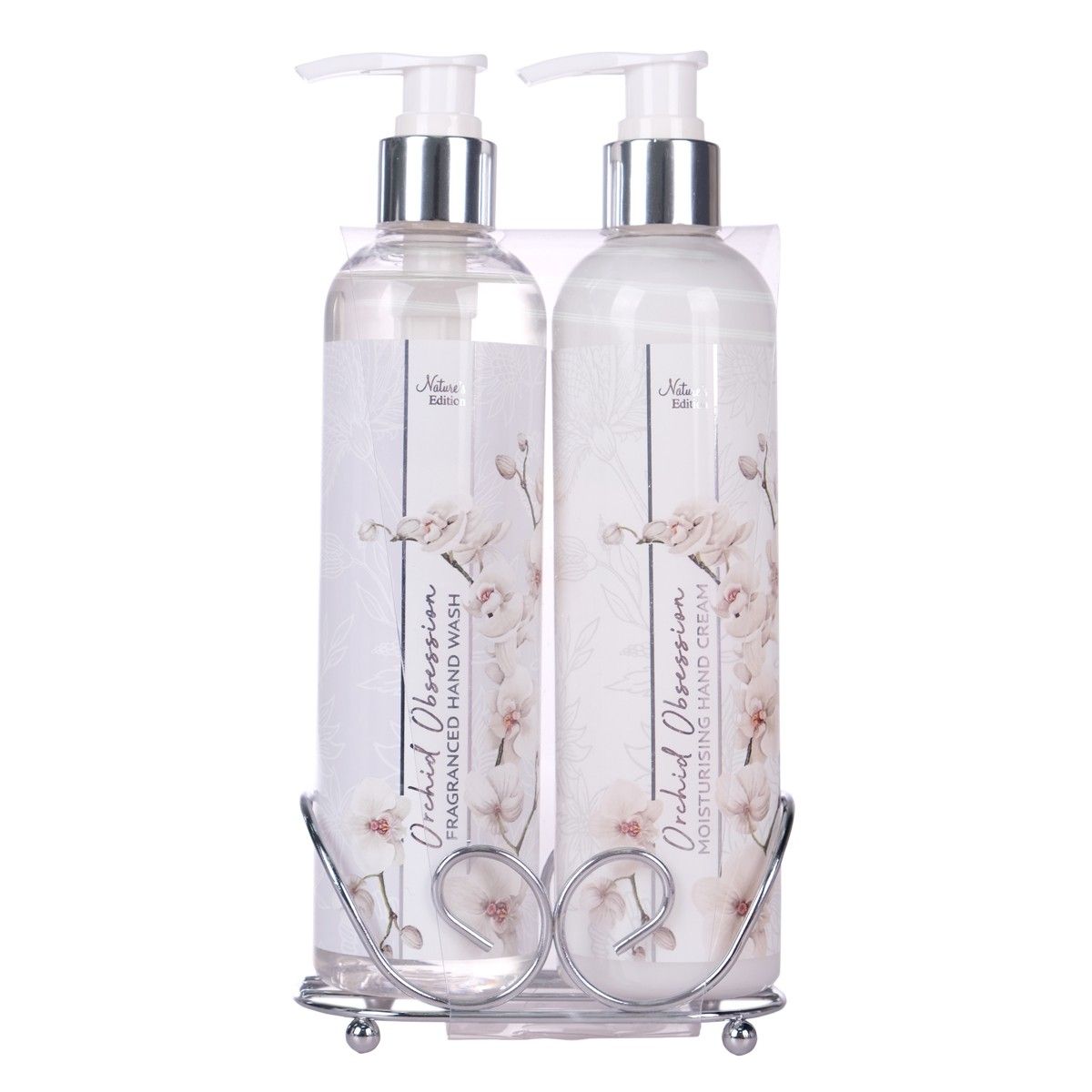 A HAND CARE DUO CADDY ESSENTIAL FOR EVERY BASIN; LUSH AND EXOTIC ORCHID SCENTED HAND WASH AND HAND CREAM TO CARE FOR YOUR HANDS.