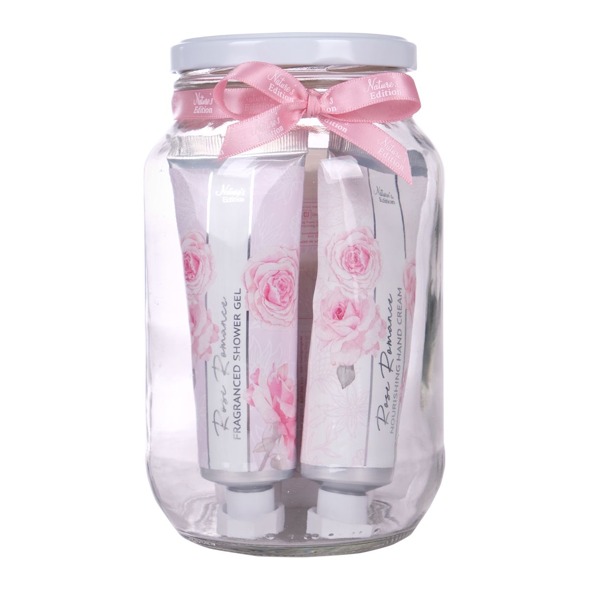 A REUSABLE GLASS JAR FULL OF SWEET AND ROMANTIC ROSE FRAGRANCED PAMPERING PRODUCTS IS A THOUGHTFUL GIFT THAT KEEPS ON GIVING.