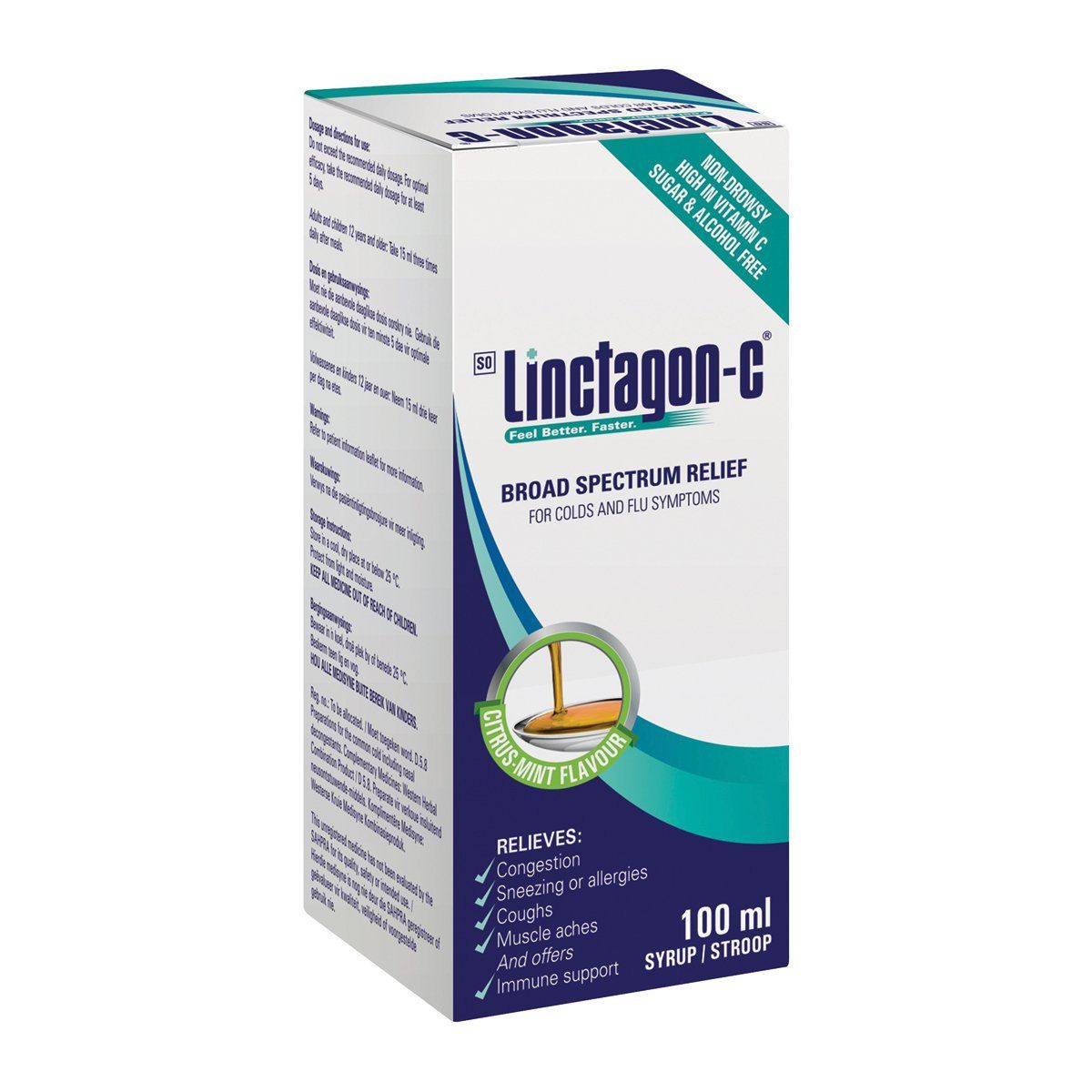 Linctagon C Adult Cold and Flu syrup is a combination syrup for the relief of symptoms associated with the common cold and flu such as congestion, sneezing, allergies, coughs, muscle aches and with immune support. Contains high levels of vitamin C.