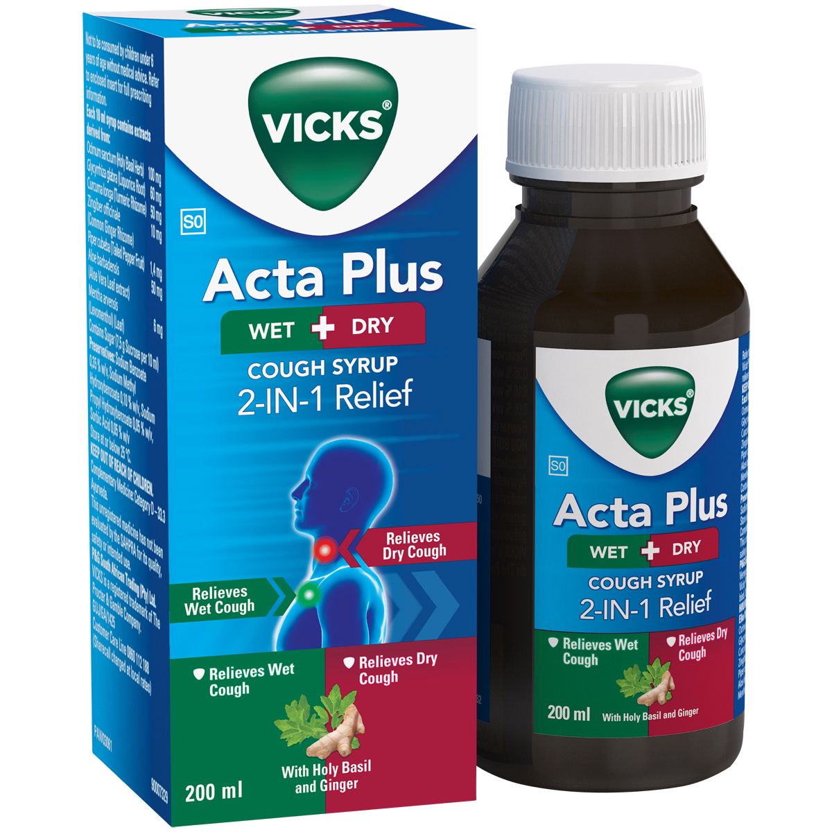 Vicks Acta Plus Wet & Dry Cough Syrup with holy basil and ginger, relieves both dry and wet coughs. Gift yourself with uninterrupted night sleep and the energy to face a new day, at home, at work, and at leisure.