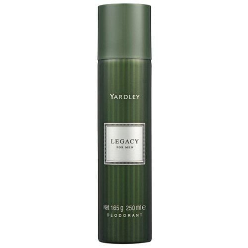 Yardley legacy for men deodorant 250ml balances fougere freshness with woody depths that make this fragrance well-rounded. This fragrance expertly blends classic notes with unusual notes. It has a strong, woody base notes of sensual musk and warm vanilla symbolises past generations. This deodorant has a fresh, crisp accords of lemon, rosemary and lavender that symbolises present and future generations.